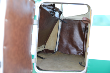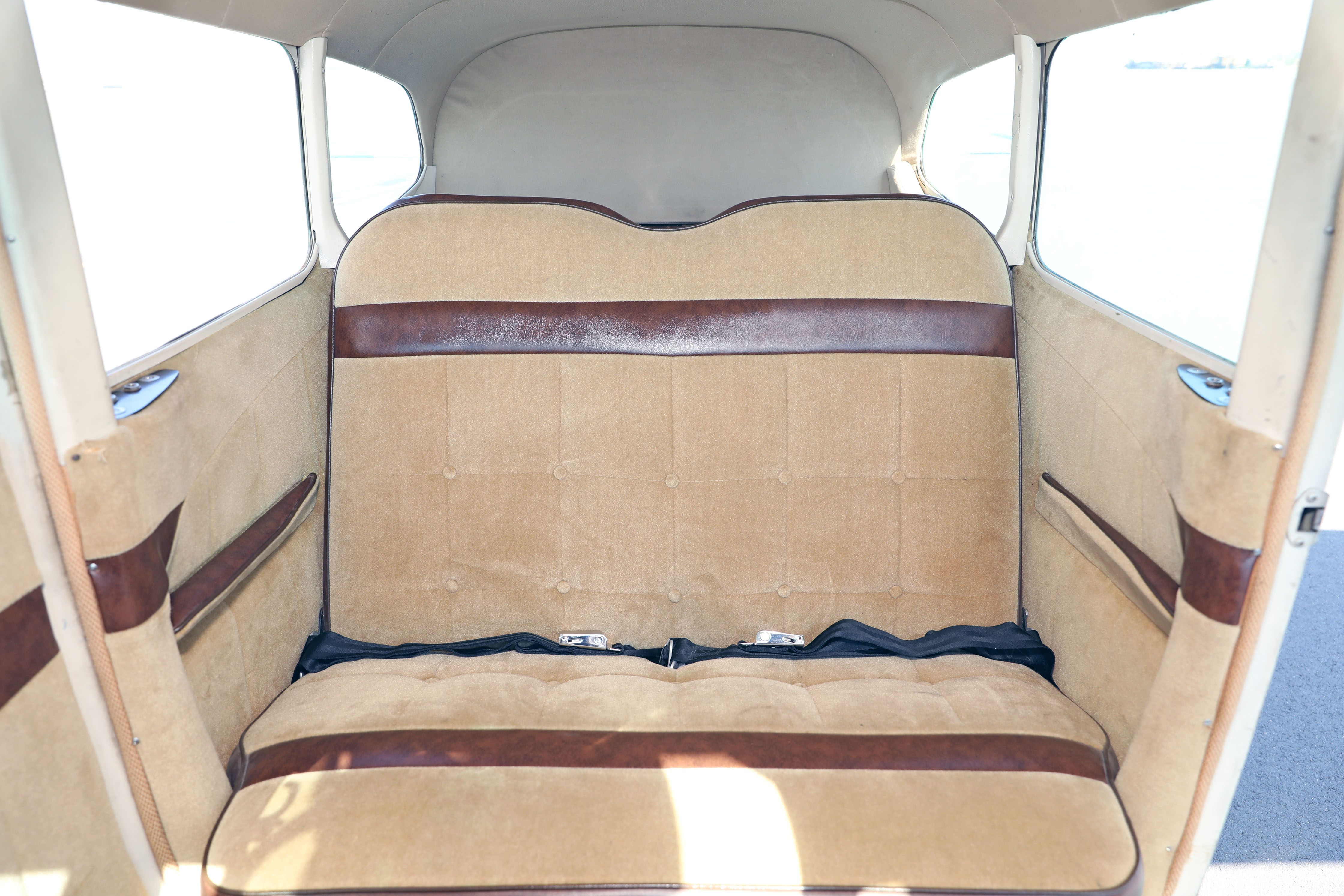 Beige fabric headliner white metal window trim Beige fabric and brown textured vinyl door and side panels Pilot/copilot beige fabric seats with brown textured vinyl inserts, shoulder harnesses/lap belts Aft cabin beige fabric bench seat with brown textured vinyl inserts and lap belts Overhead forward dimming map/instrument light, switchable cabin light and cabin speaker Forward cabin upper air vents at wing roots Beige floor carpeting Aft cabin cargo/baggage area Condition 7 (Professional Aircraft Appraisal Organization Interior Grading Guide) |