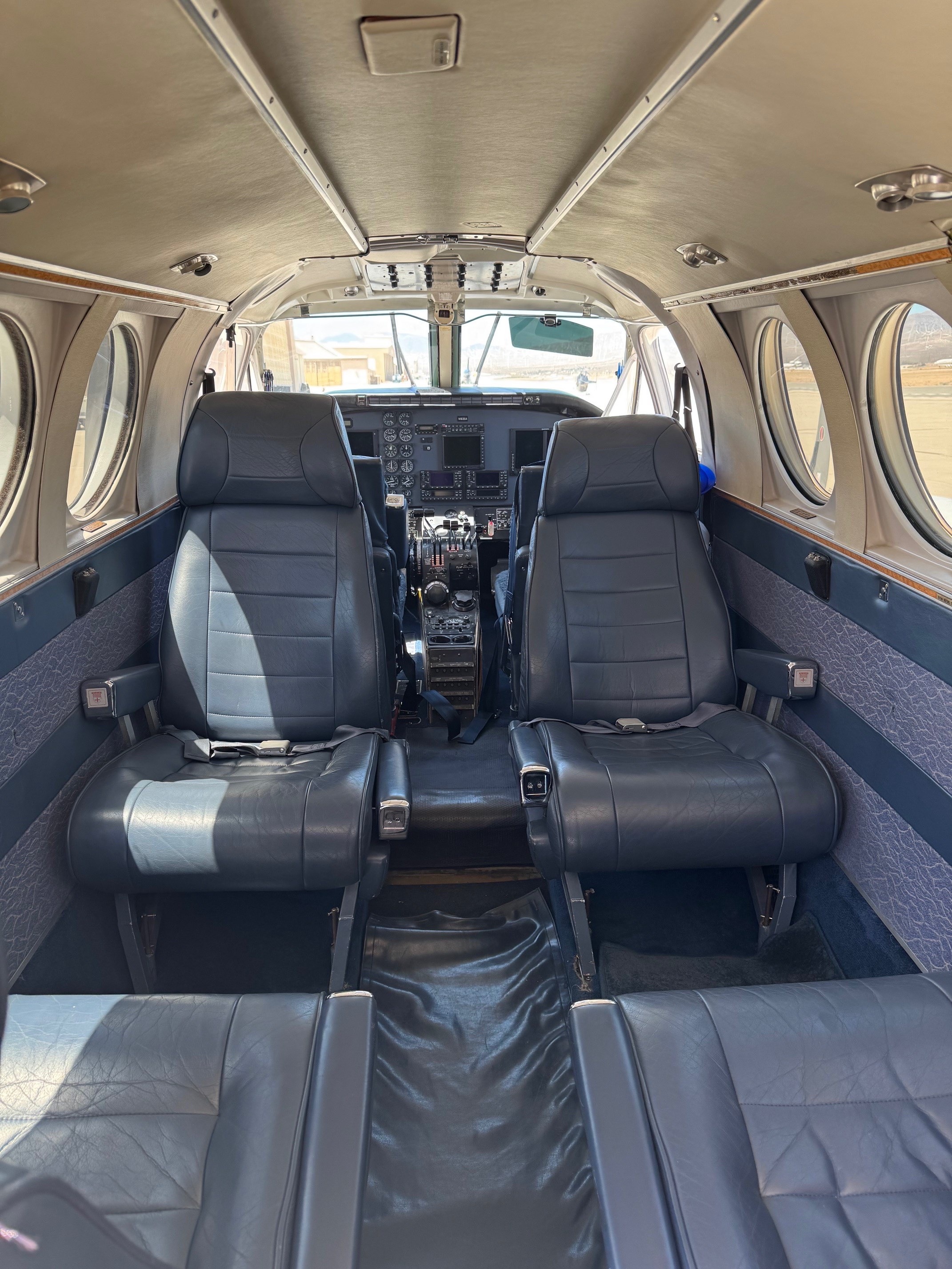 | (6) Six-place executive interior finished in blue leather seats, blue carpeting and matching side-panels. Interior includes a forward (4) four-place club with dual working tables, an aft side facing seat, and an aft forward facing belted potty seat. Interior last updated 1999. | |