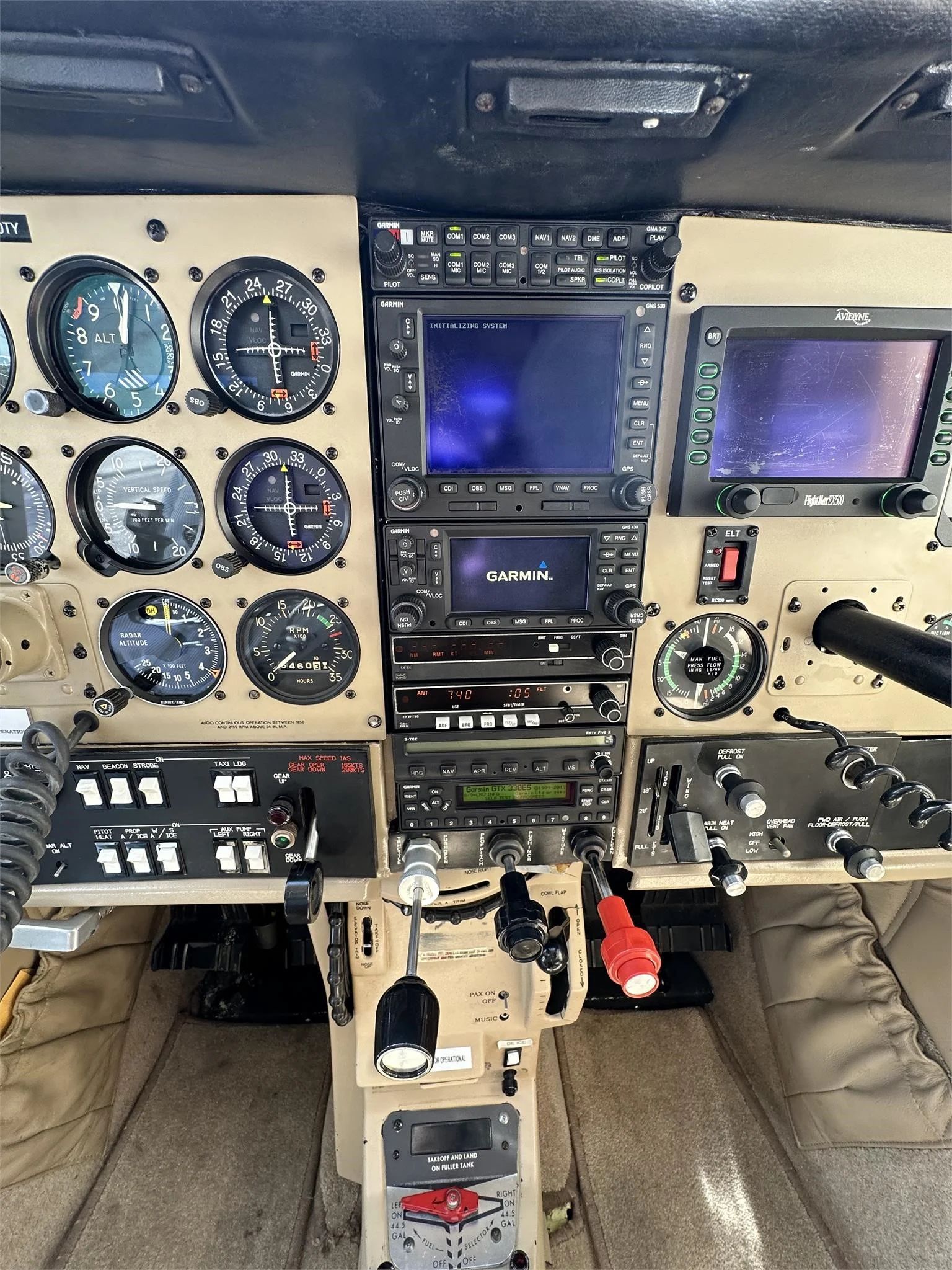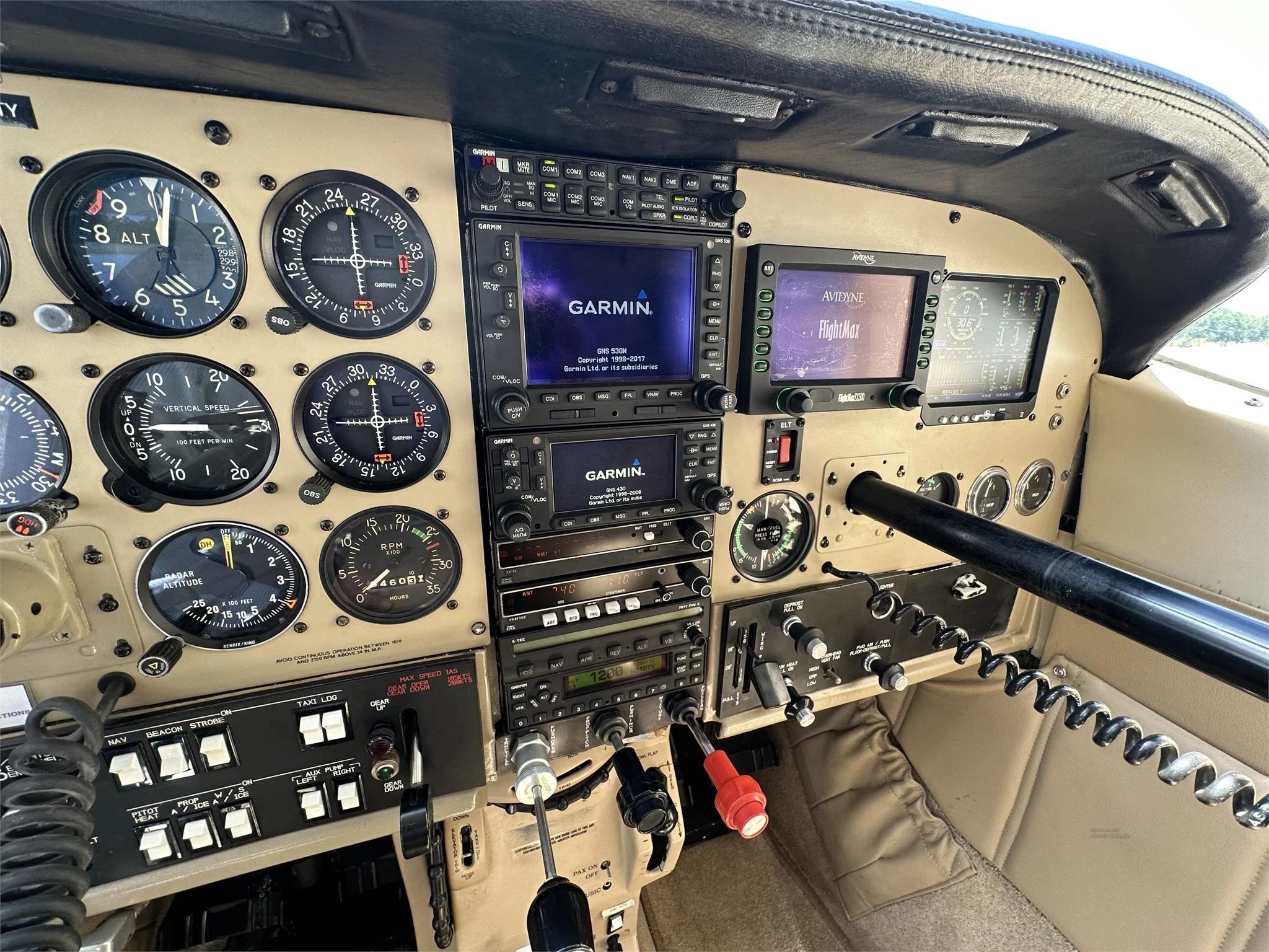 Garmin GMA 347 Audio Panel Garmin GNS 530 WAAS GPS Nav/Com MFD Garmin GNS 430 GPS Nav/Com MFD Avidyne EX 500 Flight Max MAP with Color Radar Display Bendix Radar Garmin GTX 330ES Transponder ADS-B King KRA 10 Radar Altimeter King KR 87 ADF STEC 55X Autopilot with Alt Hold, LPV Coupled, GPSS Roll Steering Intercom Dual PTT |
