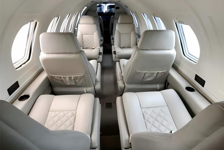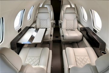 Refurbished in 2016 Configuration: Executive / 8 Passengers Seating: Cream leather w/diamond stitching & leaf green accents Layout: Mid-cabin club w/underseat storage drawers Carpet: Tan Chamois Woodwork: Dark burled wood; folding executive tables Refreshment: Forward galley Lavatory: Belted flushing aft lav w/privacy door Condition: Fireblocked Air Conditioning: Freon |