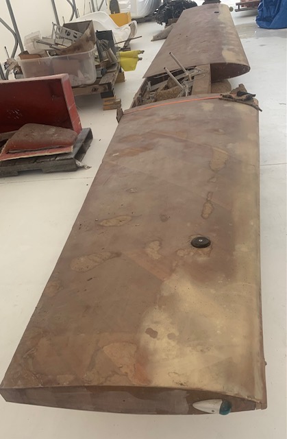 | The wing is mostly complete, the retractable landing gear worked, but will need to disassembled and checked out. Flight controls are included, need final finishing. | |