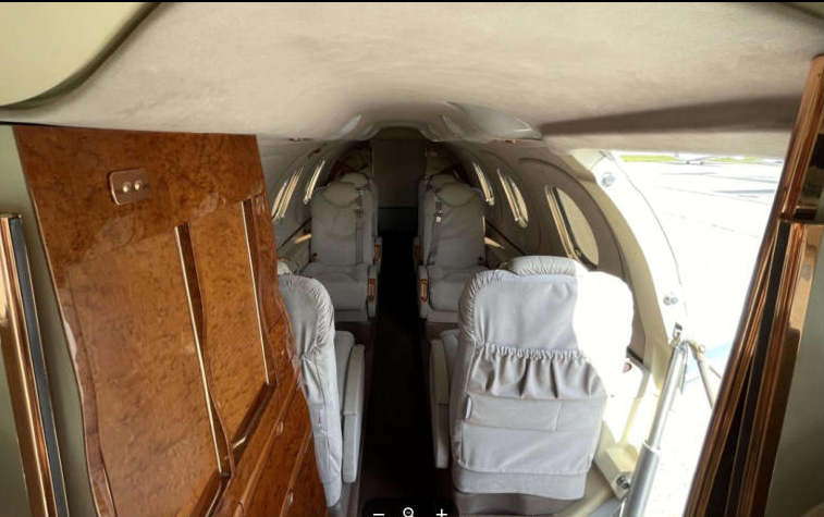 Configuration/PAX: Executive/6 passengers General: Fireblocked Seating: Mid-cabin club & dual aft forwardfacing seats w/lateral-tracking, swivel & recline, sheepskin crew seat covers Refreshment: Forward RS refreshment & baggage cabinet Cabinetry/Wood: High-gloss bird's-eye wood veneer cabinetry, dual executive writing tables w/sidewall stowage Accessories: Copper plated hardware, 220- volt outlet Storage: Sidewall storage Lavatory: Private aft lav |