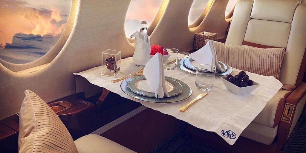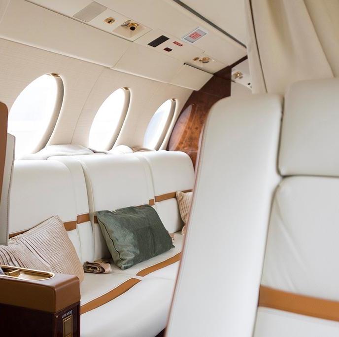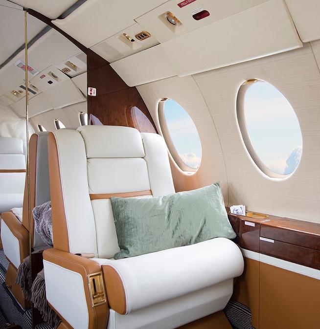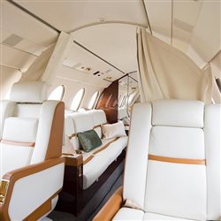 9 PAX Configuration Four forward club seats Almond ultra leather headliner Aft 3-place divan Tan focus grid carpeting w/ band Dual single seats Galley w/ Mojave sand countertops, microwave oven, coffee-maker, LS auxiliary galley High-gloss Pommele mahogany cabinetry Dual forward console tables, aft console table, fold down center table Airshow 400 w/ 15-inch monitor Satin rose gold metal plating, bronze mirror accents, alt vanity w/ sink w/ hot & cold running water Flushing aft Lav |