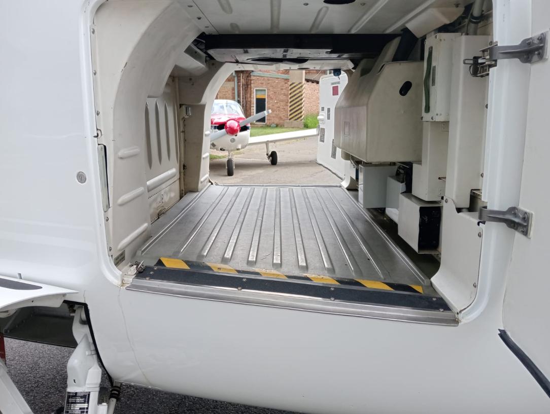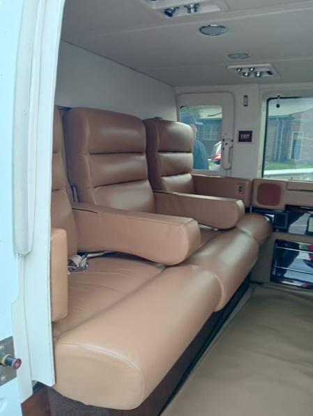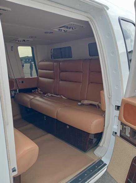 Cockpit: Two-Place Brown Leather Seats with Sheepskin Covers Cabin: Six-Place Executive Club in Brown Leather Wooden Storage Cabinets Under Seats Foldable Centre Seats and Deviding Armrests |