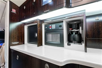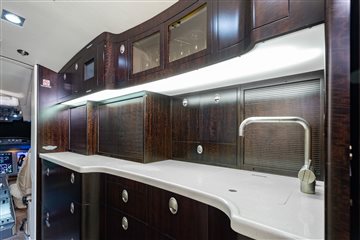 This elegant eight passenger (8) cabin features a four-person club seating arrangement in the forward cabin, followed by a four-place club in the aft cabin. The aircraft includes a cockpit jump seat that is certified for takeoff and landing (crew only). Forward Cabin: Four-Place Club (4) Aft Cabin: Four-Place Club (4) The forward galley is well-equipped with a Hi-Temp Oven, Microwave Oven, Coffee Maker, and Food Chiller. The aft cabin includes a luxurious aft lavatory and in-flight accessible baggage bay. |
