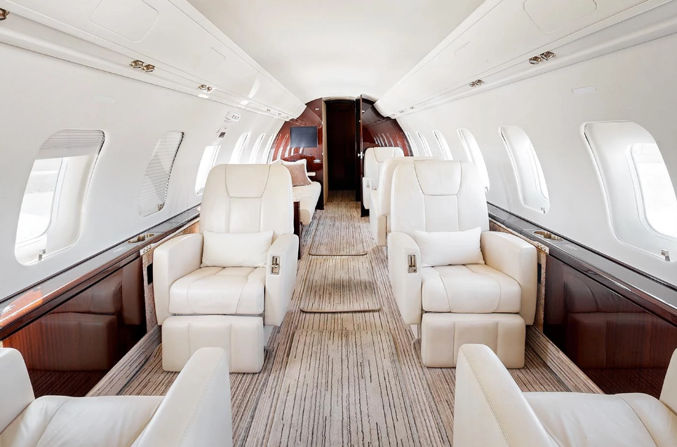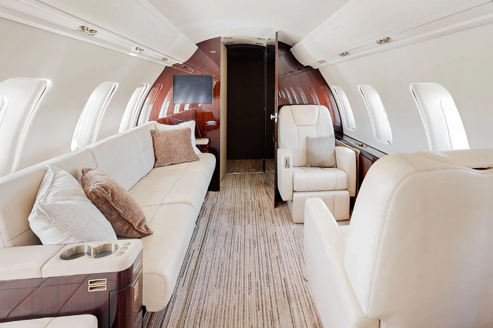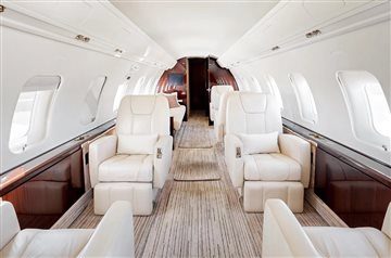 | Bombardier Completions Center, Montreal, August 2011 Fireblocked, TCCA, FAA and EASA STC Ten (10) place executive interior configuration. Jump seat is for crew use only Galley Forward RH galley Forward cabin The forward cabin features four (4) place club seating w/ pull out tables Aft cabin The aft cabin features two (2) club seats w/ a table on the LH side, and a full berthing four (4) place divan on the right Lavatory Also featured is an aft standard lavatory | |