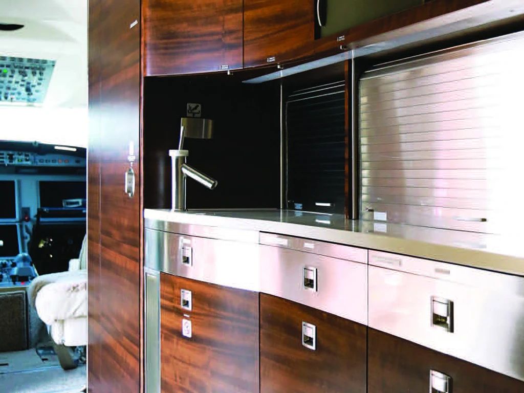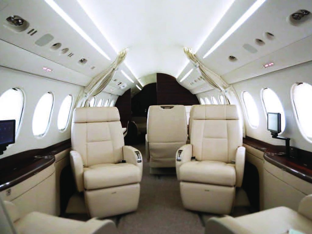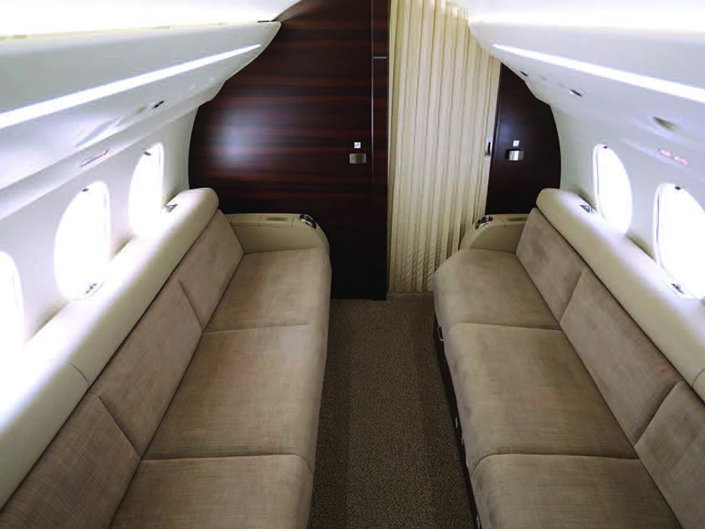 Beige (light sand) color leather seats, light beige (fabric & leather) divans, “all-over-the-pattern” carpet, and Satin Australian Walnut wood veneer. Brushed Satin Nickel metal plating. SEATING: 12 Pax (14 seats) Floorplan w/3rd Crew Seat, Fwd and Aft Lavatories, Galley pocket door, Aft Cabin divider w/stowable curtain, Aft Divans w/electrical berthing. |