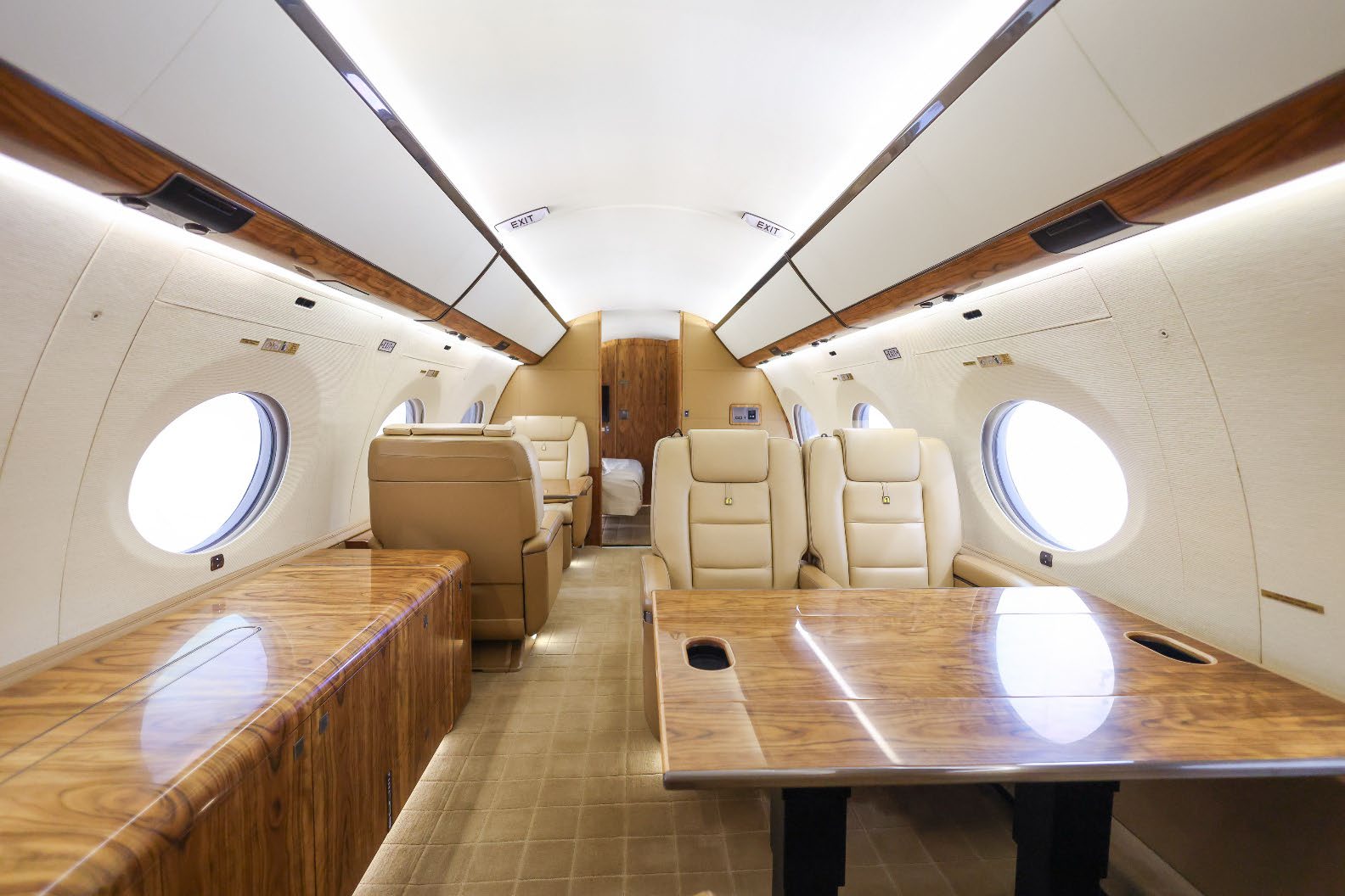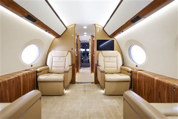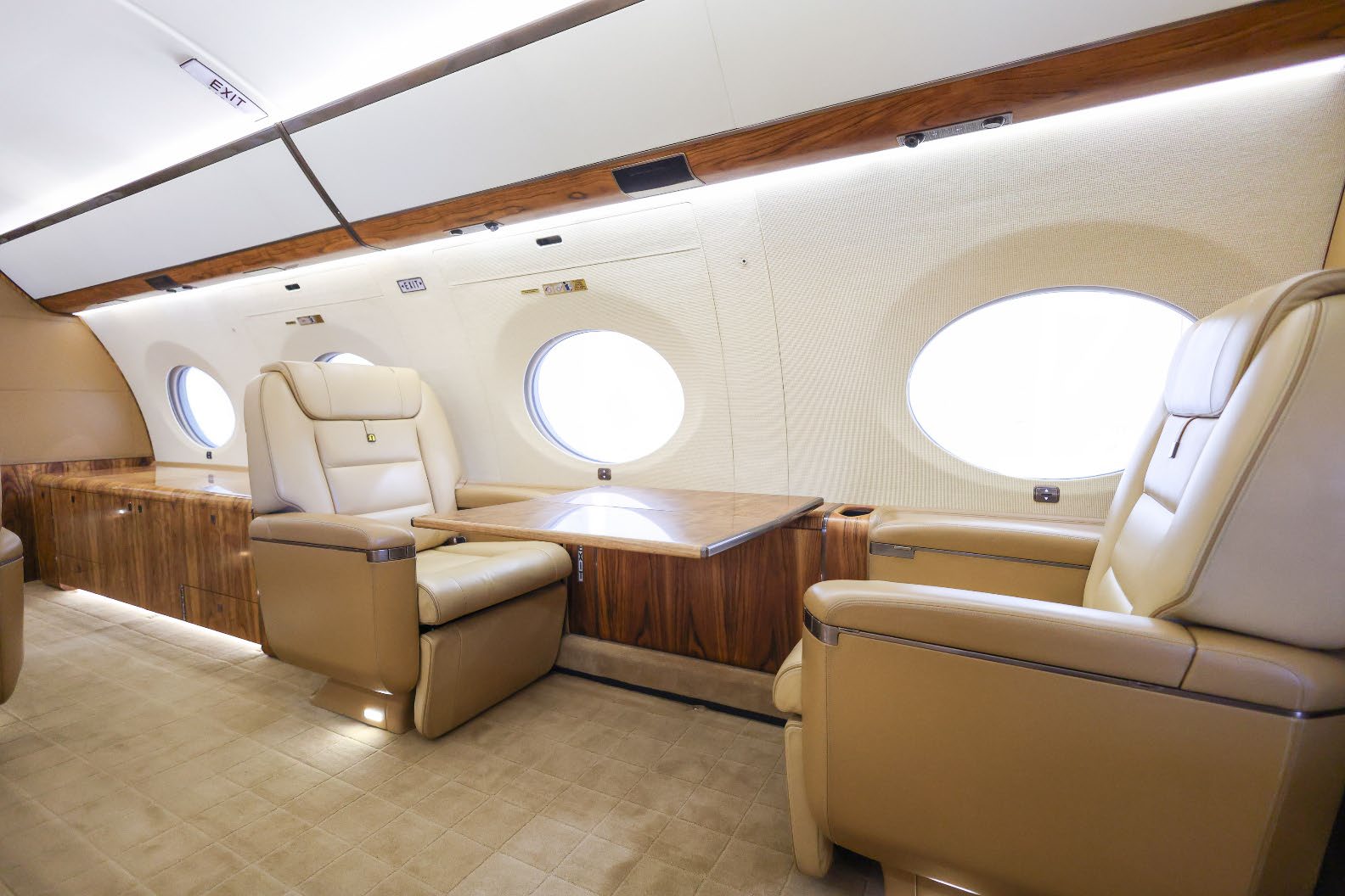 NUMBER OF PASSENGERS - Fiveteen (15) FWD VESTIBULE - Four (4) Place Captain Chairs. Curtain Between 1st And 2nd Section. FWD CABIN CONFIGURATION - Four (4) Place Conference Group Left With Credenza Right. Popup Monitor. MID CABIN CONFIGURATION - Two (2) Single Seats Left Across From Divan Right. Pocket Door Between 3rd And 4th Section AFT CABIN CONFIGURATION - Right Hand Side Divan With Single Seat, Foldout Table And Dual Bulkhead Mounted Monitors, Floor To Ceiling Storage Closet Behind Single Seat GALLEY - Fully equipped two-sided Galley GALLEY EQUIPMENT - Stainless Steel Trimmed Appliance Stack Comprised of: Two Coffee Makers, Microwave Oven, Pull-out Work Surface, Convection Oven, Refrigerator With Upper Freezer Section, Two Separate Ice Drawers, One Large Drink Storage Drawer With Secondary Soda Can Drawer, Sink With Hot / Cold Water Faucet, Soild Surface Counter Tops With Sink Cover, Lighted Overhead Storage On Both Sides For Crystal, Flat Ware And China Storage Inserts On Left Side Drawers Below Sink, Large Storage Areas For Supplies, Food, Beverages And Waste, Water Sterilization System, Color Touch-screen Control Panel (GCMS-2), Motorized Pocket Door Separating Galley From Cabin Area. LAV - Fwd. & Aft: Vacuum toilets, Sinks with hot / cold water faucet controlled by pressure mats, Solid surface countertops, Mirror, vanity and indirect lighting, Upper medicine cabinet with mirror in Aft lavatory Dedicated Sleep Mode Designed And Installed By Gulfstream: EXTRAS 1. Turns Off All Lighting In Cabin Section 2. Includes Turning Off All PSU, Window Lighted Switches And Monitors 3. Turns Off Aft Lav Lighting 4. Provides A Truly Full Dark Sleeping Area |