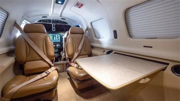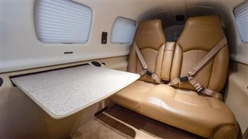 Premium Dune (Tan) Leather Interior with Coordinated Side Panels, Carpet, and Headliner. Fold-out Executive Table, Individual Reading Lights, Accent Lights, Phone/Mic/Aux Music Input Jacks. Fold Down Crew & Middle Row Seats for Easier Cockpit Access. 110V Power Plugs in Cockpit & Cabin. |