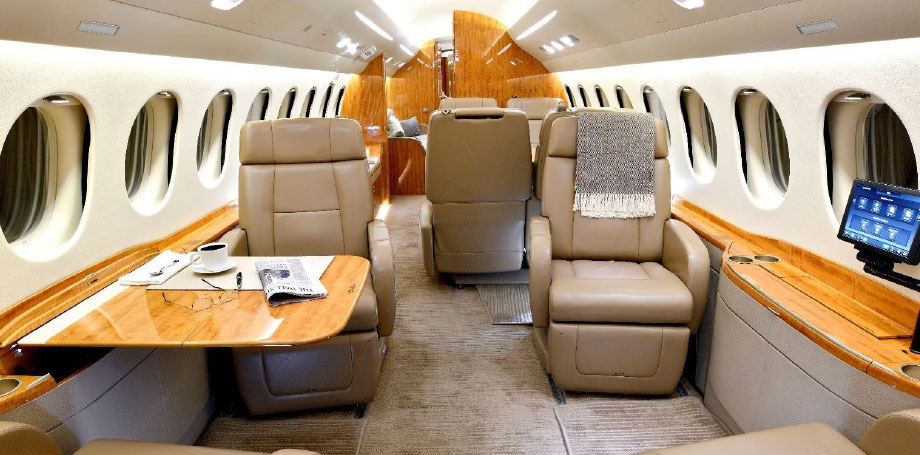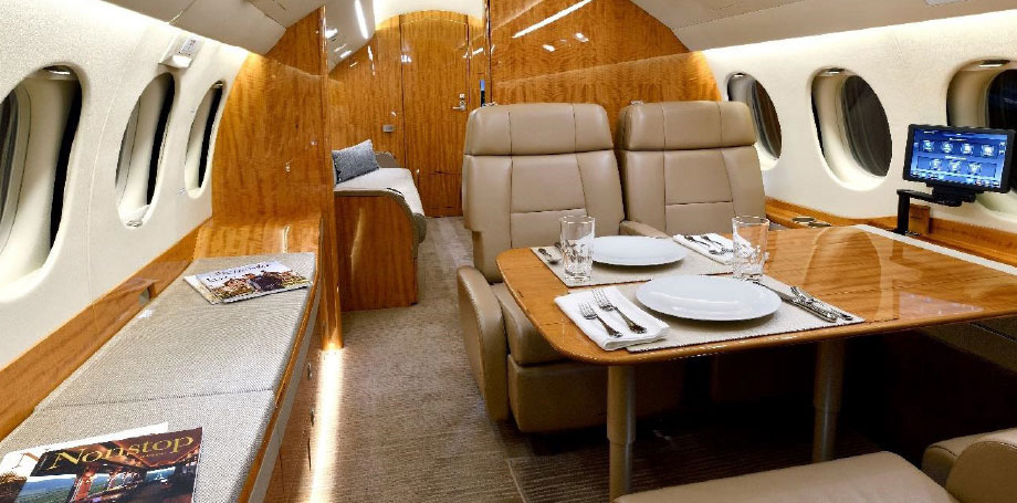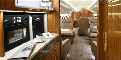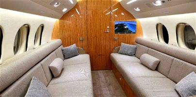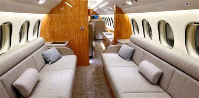| Executive fourteen (14) passenger interior featuring a four-place club in the forward cabin, a four-place conference table facing a credenza in the mid cabin, and dual three person berthable divans in the aft cabin. This aircraft also features a forward galley, forward crew lavatory, spacious aft passenger lavatory, in-flight accessible baggage, and cockpit jumpseat. | |