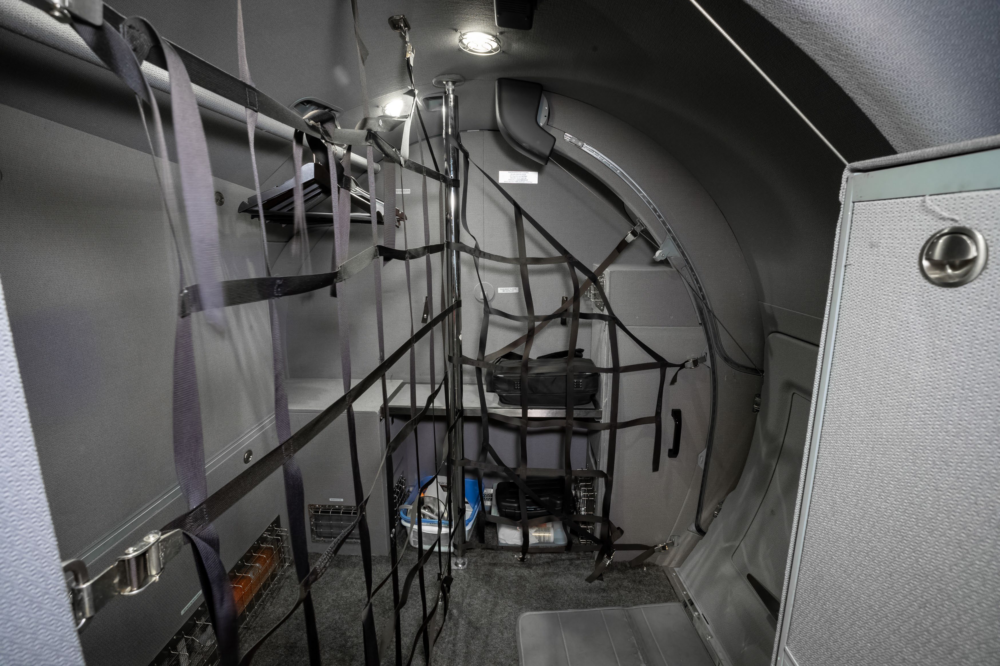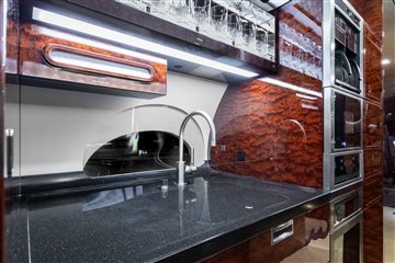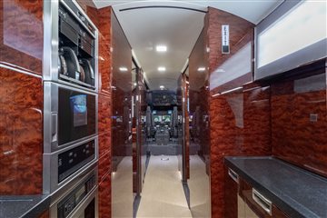 This elegantly appointed fifteen(15) passenger floor plan features crew rest as well as three distinct passenger cabin areas with a fwd. galley and both forward and aft lavatories. Forward Cabin: 4 single seats with two console tables. Mid Cabin: Two(2) single seats and one Four-place (4) conference group Aft Cabin: Two (2) club seats across from Three-place (3) divan Fwd. Galley: Includes refrigerator/ freezer combination unit, high temp oven, microwave oven, and (2) coffee makers. Forward and Aft Lavatories: Forward & aft vacuum toilets with outside servicing capability |