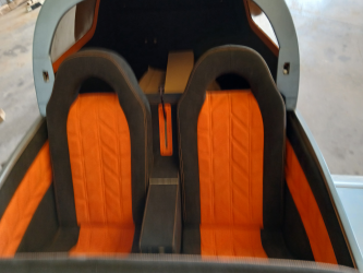 | NEW 2024, BLACK IMITATION SUEDE W/ ORANGE IMITATION SUEDE SEATS WITH STITCHING AND INSERTS AND MATCHING INSTRUMENT PANEL COVER. | |
